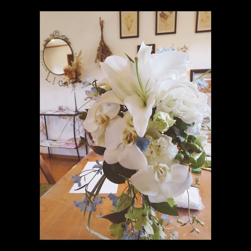 カサブランカと胡蝶蘭のキャスケードブーケ