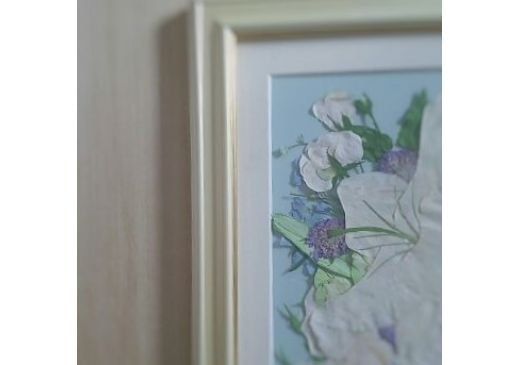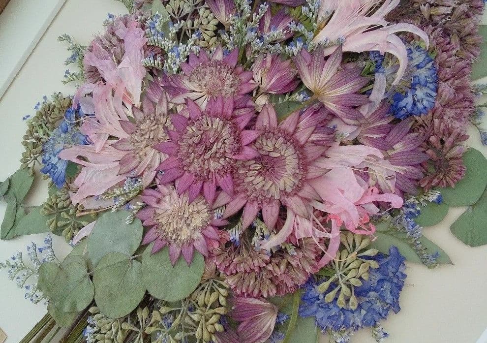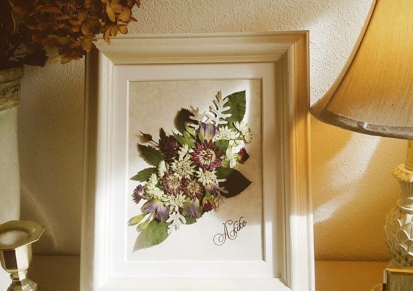 そんなある日、ネットで見つけた花束を残せる押し花のあまりの美しさに感動。お花とは無縁だったのに「私も押し花を作れるようになりたい!これこそ私が目指す道だ!」とムクムクと熱い想いが芽生えてきたのです。それからは、東京と御代田の2つの教室に通い、押し花を習うのが楽しくて、どんどん自分ができることも増えていきました。そして6年前に、会社を退職し押し花で起業しました。